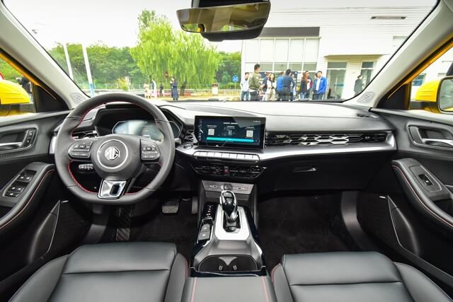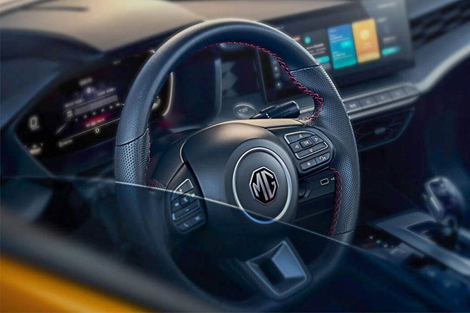 Khoang nội thất đáng tiền của mẫu sedan hạng C MG5 2021 có kiểu thiết kế pha trộn giữa cần số BMW, tay lái D-Cut tương tự Mercedes-Benz, táp lô bảng điều khển mang hơi hướng của Audi.