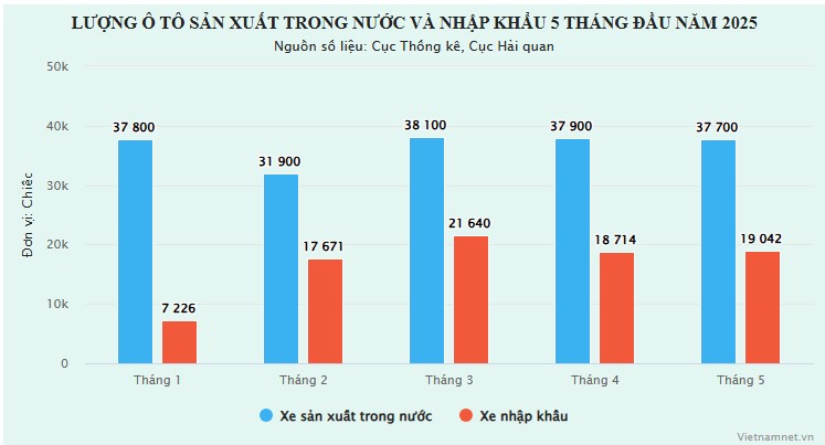 Lượng xe nhập khẩu cộng dồn trong 5 tháng đầu năm đạt 68.280 chiếc, trong khi xe sản xuất lắp ráp trong nước bán ra chỉ đạt 62.764 chiếc.