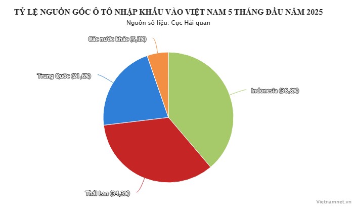 Về cơ cấu nguồn gốc, ô tô nhập khẩu nguyên chiếc được đưa về nước trong 5 tháng đầu năm chủ yếu có xuất xứ từ Indonesia, Thái Lan và Trung Quốc. Riêng 3 quốc gia này đã chiếm 94,7% về số lượng xe nhập khẩu trong 5 tháng đầu năm 2025.