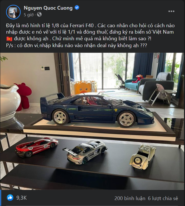 Mới đây, doanh nhân Nguyễn Quốc Cường đã đăng tải lên trang cá nhân hình ảnh chiếc mô hình siêu xe Ferrari F40 tỉ lệ 1:8 với dòng trạng thái thể hiện mong muốn tìm cách đưa mẫu siêu xe huyền thoại này về nước.