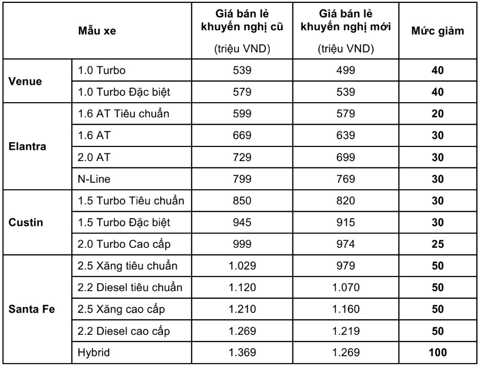 Trong số đó, Hyundai Santa Fe Hybrid nhận được mức giảm giá mạnh nhất trong đợt điều chỉnh này với mức giảm 100 triệu đồng, giờ xe chỉ còn bán ra với giá 1,269 tỷ đồng. Ngoài ra, Hyundai Venue mới được bán ra chưa đầy 6 tháng nhưng cũng được điều chỉnh giảm 40 triệu đồng cho cả 2 phiên bản, giá khởi điểm của xe chỉ còn từ 499 triệu đồng.