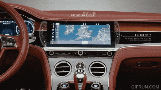Cách mạng lớn nhất trong cabin xe Bentley trong những năm gần đây là màn hình xoay 3 mặt Bentley Rotating Display. Tiêu tốn của thương hiệu Anh Quốc hơn 3 năm phát triển, đây là màn hình giúp người dùng chuyển đổi qua lại giữa giao diện màn cảm ứng bình thường, 3 đồng hồ cổ điển hay đơn giản là bề mặt trơn giống phần còn lại của táp lô.