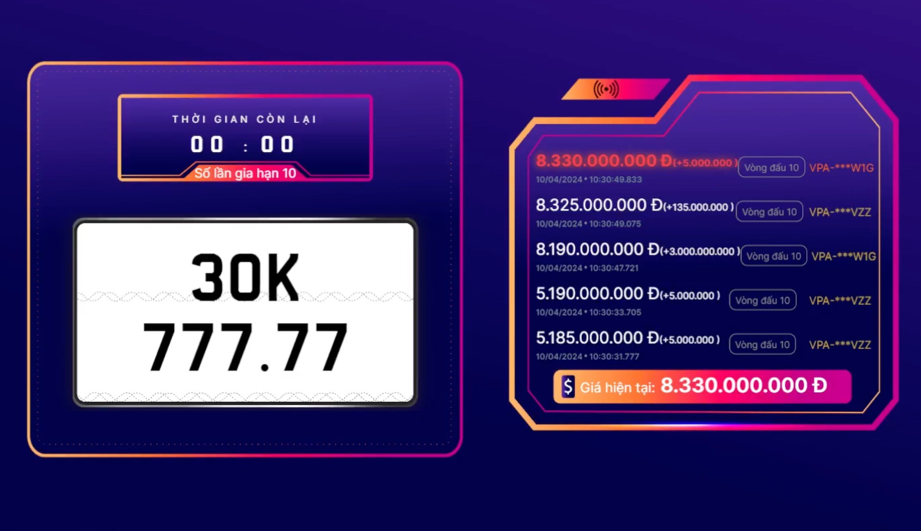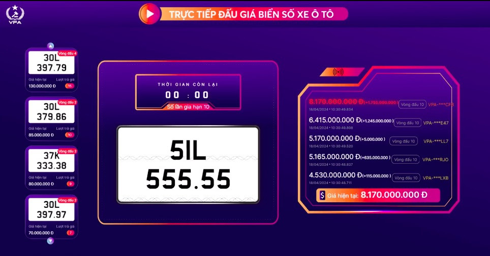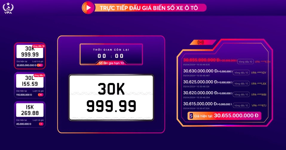 Chiều 10/4, biển số ngũ quý 9 siêu VIP của TP. HCM 51K-999.99 được đưa lên sàn trong khung giờ 14h45-15h10. Sau 25 phút của vòng đấu chính thức và 10 vòng đấu gia hạn với tổng cộng 108 lượt trả giá, cuối cùng, biển ngũ quý 9 này đã được chốt với số tiền 21,5 tỷ đồng.