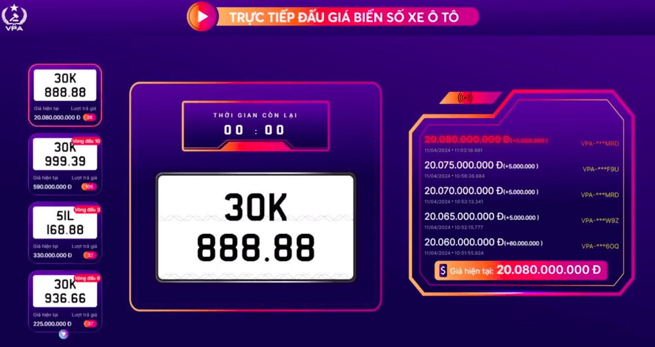 Trên thực tế, phiên đấu giá biển số ngũ quý 8 này lại được định đoạt ngay trong thời gian 25 phút đấu chính thức mà không có bất cứ một vòng gia hạn nào. Kết quả, biển số 30K-888.88 được chốt với mức giá 20,08 tỷ đồng sau 28 lượt trả giá.