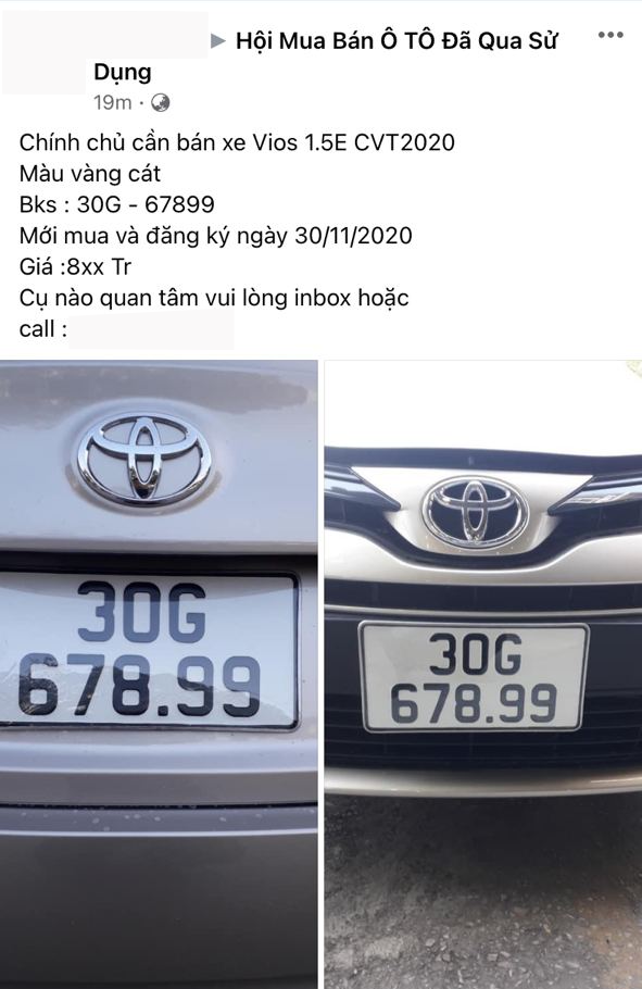 Đầu tháng 12/2020, cộng đồng mạng chia sẻ câu chuyện chiếc Toyota Vios bản E CVT đời 2020 được chủ nhân bán lại với giá hơn 800 triệu đồng, dù giá xe sau đăng ký chỉ khoảng 594 triệu đồng. Nguyên nhân là do chủ xe "bốc" được biển số 30G-678.99, được đánh giá là đẹp cả về thẩm mỹ và ý nghĩa.