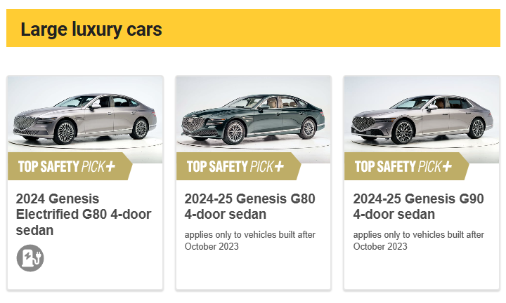 Thương hiệu hạng sang của Hyundai là Genesis đã ẵm trọn toàn bộ giải thưởng Top Safety Pick+ ở hạng mục xe cỡ lớn hạng sang với ba mẫu xe Genesis G80 2024-2025, G80 Electrified 2024 và G90 2024-2025.