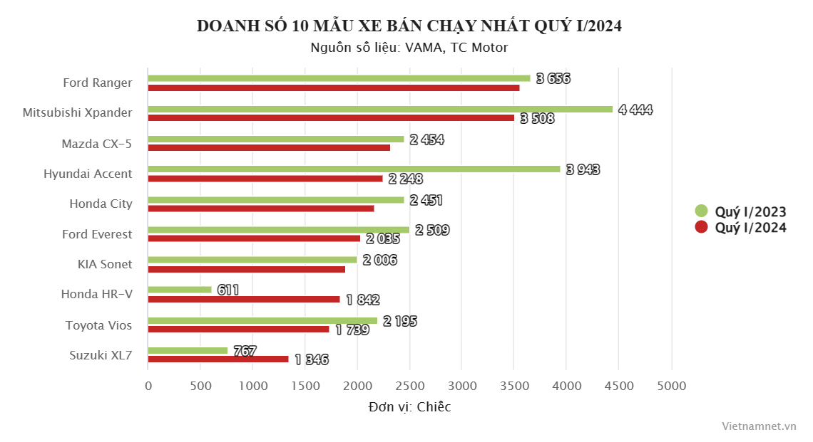 Dưới đây là 10 mẫu xe bán chạy nhất trong quý I/2024 vừa qua: