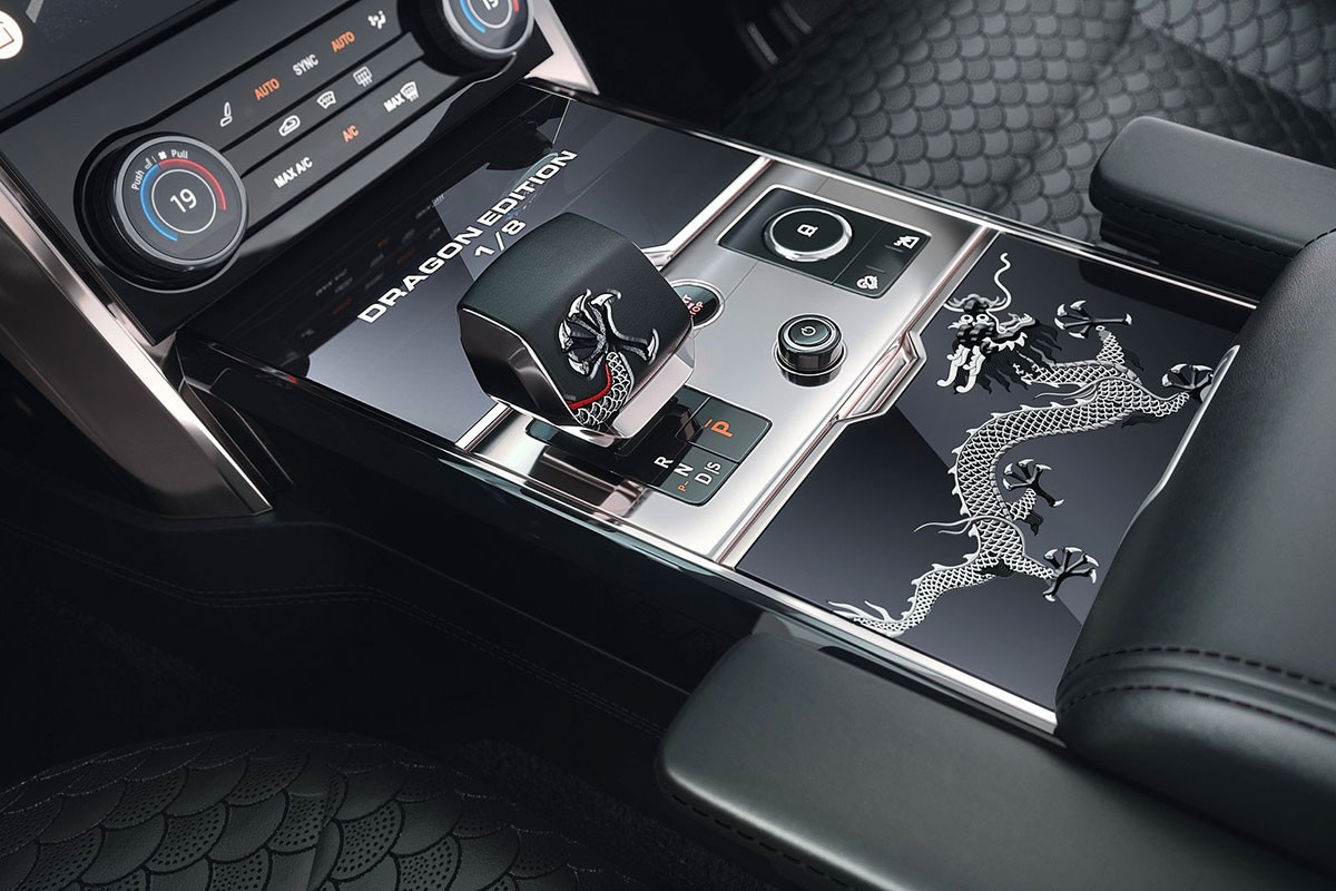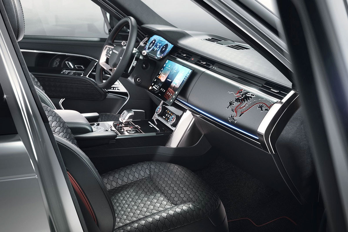 So với phần ngoại thất khá ít điểm nhấn, nội thất của Range Rover Dragon Edition mang đến bầu không khí của năm rồng rất rõ nét. Chi tiết hình rồng xuất hiện ở khu vực bảng táp-lô, hộc chứa đồ trung tâm, lưng ghế.