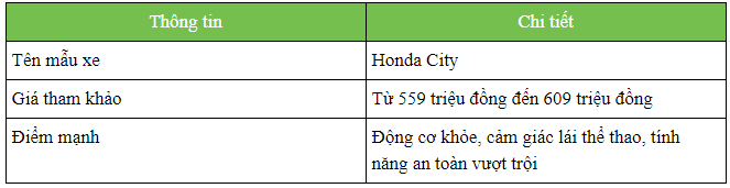 Điều đáng cân nhắc với Honda City là mẫu xe này được bán với giá cao nhất phân khúc - bản RS được niêm yết với giá 609 triệu đồng. Tuy nhiên, người sử dụng Honda City sẽ được trải nghiệm gói tính năng an toàn Honda Sensing rất hiện đại với những tính năng như hỗ trợ giữ làn, đèn pha thích ứng tự động, hay ga tự động thông minh.