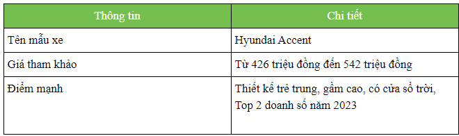 Trong năm 2023, Hyundai Accent chính là mẫu sedan bán chạy nhất thị trường; nếu xét tổng thể thị trường, mẫu xe này còn xếp thứ 2 với 17.452 chiếc, xếp sau Mitsubishi Xpander với 19.740 chiếc.