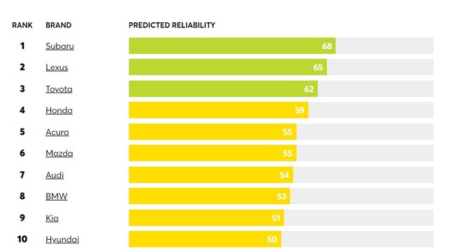 Tuy nhiên, đứng đầu top 10 thương hiệu ô tô đáng tin cậy nhất của Consumer Report lại là Subaru với điểm đánh giá 68/100.