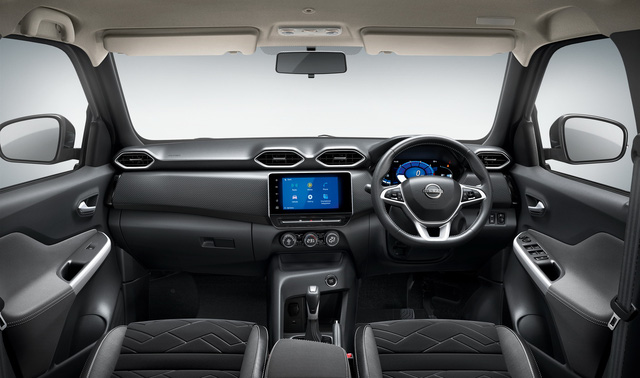 Bước chân vào nội thất Magnite, trung tâm cabin là màn cảm ứng 8 inch hỗ trợ Apple CarPlay lẫn Android Auto, bên dưới là hệ thống điều chỉnh điều hòa cùng hốc đựng đồ mini. Đằng sau vô lăng 3 chấu trước mặt người lái là màn TFT 7 inch. Ngoài ra Magnite cũng sở hữu nút bấm khởi động, cửa sổ bên lẫn gương bên chỉnh điện, tựa tay cỡ lớn cho hàng ghế trước và "nội thất rộng rãi nhất phân khúc".