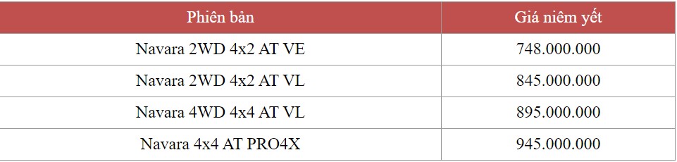 Nissan Navara 2021 có giá từ 748 triệu đến 945 triệu đồng. Xe được bảo hành 5 năm hoặc 100.000 km. Mức giá này cao hơn đáng kể so với đối thủ Ford Ranger (616 triệu đến 925 triệu đồng).