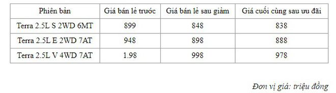 Tuỳ phiên bản mà các mức giảm giá khác nhau. Bản cao cấp nhất Terra V có giá sau khi điều chỉnh còn 998 triệu đồng. Giá cũ là 1,098 tỷ đồng. Các bản Terra E và Terra S giảm lần lượt 50 triệu và 51 triệu, còn 898 triệu và 848 triệu đồng.