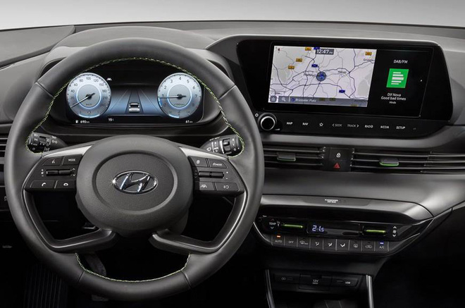 Nhìn cận cảnh, chiếc ô tô này không chỉ có 1 mà có đến 2 màn hình 10,25 inch bên trong cabin. Bên cạnh màn hình cảm ứng trung tâm định hướng theo chiều ngang, i20 có cụm đồng hồ kỹ thuật số 10,25 inch phía sau tay lái. Bố cục màn hình có thể được thay đổi, cho phép cá nhân hóa.