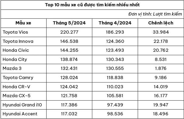 Theo dữ liệu từ Công ty cổ phần Nextgen Việt Nam cung cấp cho thấy các mẫu xe cũ được tìm kiếm nhiều nhất chủ yếu là xe phổ thông, tiết kiệm nhiên liệu, giá cả hợp lý.