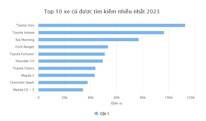 Trong số top 10 mẫu xe cũ được tìm kiếm nhiều nhất năm 2023 phía trên, Toyota chiếm 4 mẫu, tức 40% là Vios, Innova, Fortuner và Camry.