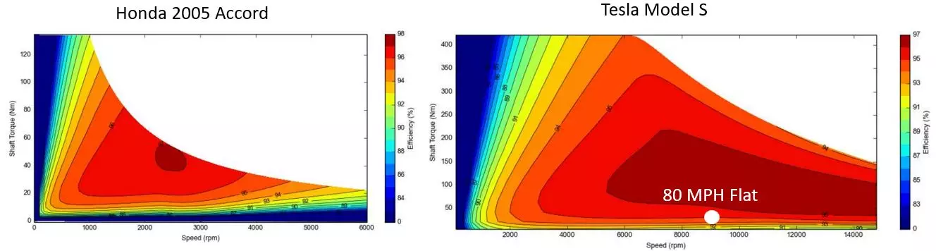 Tất nhiên là càng ngày các động cơ điện (mô-tơ) càng được cải thiện hiệu quả, nghĩa là công nghệ càng tiến lên và các động cơ đời sau có vùng làm việc hiệu quả theo mô-men và tốc độ lớn hơn. Hãy xem hình đồ họa miêu tả hoạt động của động cơ giữa Tesla Model S và Honda Accord 2005 dưới đây.