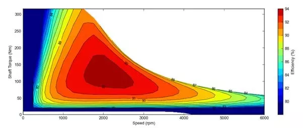 Trong hình trên là đồ thị thể hiện sự hiệu quả của động cơ điện lắp trên ô tô. Hiệu quả (Efficiency) của việc chuyển điện năng thành động năng cho xe có thể dao động từ 50-94%. Những vùng màu sậm là khi việc chuyển đổi điện thành chuyển động hiệu quả nhất, các vùng màu nhạt thể hiện sự kém hiệu quả hơn trong việc này.