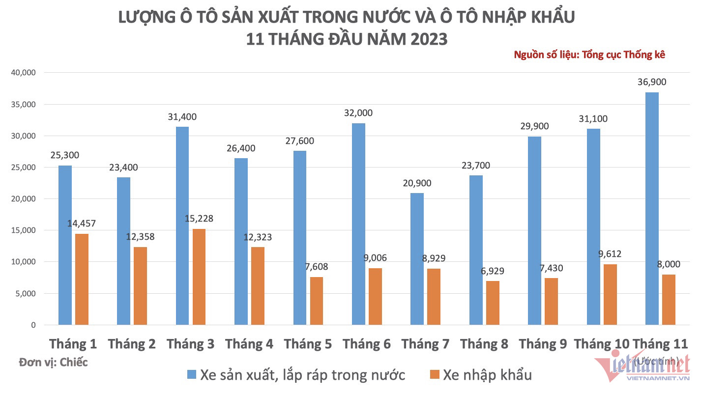 Trong tháng 11, ước tính có tới khoảng 44.900 chiếc ô tô mới được bổ sung cho thị trường Việt Nam, bao gồm cả xe nhập khẩu và xe sản xuất trong nước, tăng 10,3% so với tháng 10 (với 40.712 chiếc). Riêng sản lượng ô tô sản xuất lắp ráp trong nước tháng 11 ước đạt 36.900 chiếc, tăng tới 18,6% so với tháng 10 (với 31.100 chiếc) và tăng 5,4% so với cùng kỳ năm 2022.
