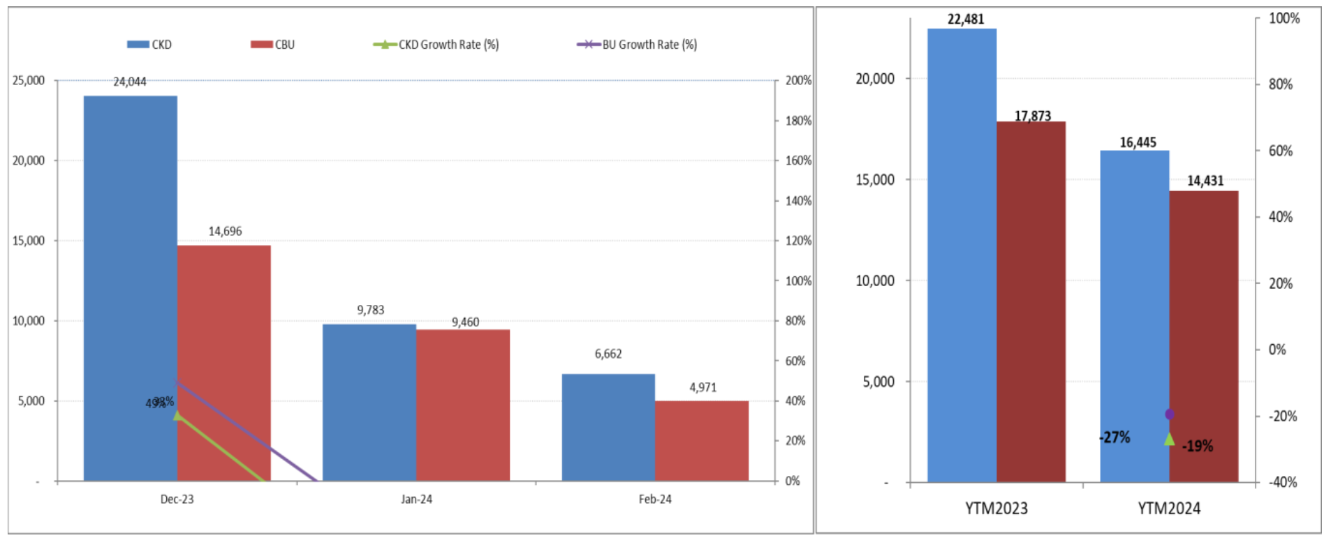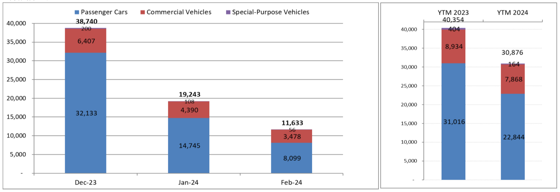 Tính chung 2 tháng đầu năm 2024, tổng doanh số bán hàng toàn thị trường theo VAMA tổng hợp và TC Motor công bố đạt 36.478 xe (gồm 30.876 xe do VAMA tổng hợp, đã bao gồm xe Hyundai CBU và 5.602 xe Hyundai CKD do TC Motor công bố riêng). Con số này giảm 26% so với cùng kỳ năm 2023. Trong đó, xe ô tô du lịch giảm 26%; xe thương mại giảm 12% và xe chuyên dụng giảm 59%.