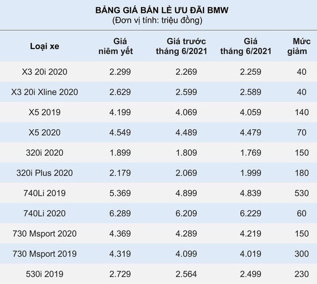 Trong đó, mẫu SUV BMW X3 sản xuất năm 2020 đang được các đại lý giảm giá từ 40 triệu đồng, mẫu SUV 7 chỗ ngồi BMW X5 giảm 70-140 triệu đồng; mẫu xe BMW 530i giảm giá 230 triệu đồng; dòng xe giảm giá cao nhất là BMW 7 Series với mức giảm từ 60-530 triệu đồng.