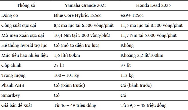 Yamaha Grande 2025 trang bị động cơ Blue Core 125cc hybrid, cho công suất tối đa 8,2 mã lực tại 6.500 vòng/phút và mô-men xoắn cực đại 10,4 Nm tại 5.000 vòng/phút. Đặc biệt, công nghệ hybrid bổ sung thêm mô-tơ điện có thể hỗ trợ tăng tốc trong 3 giây đầu tiên, giúp xe vận hành mượt mà và tiết kiệm nhiên liệu hơn.