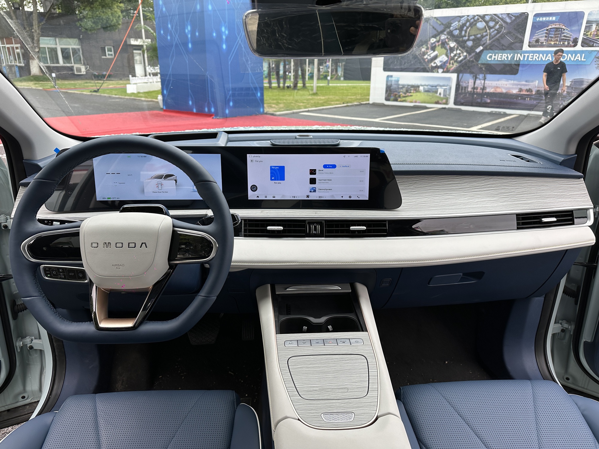 Bên trong cabin Omoda E5 thay đổi khá nhiều so với phiên bản thuần xăng. Đầu tiên phải kể tới khu vực táp-lô thiết kế dạng hai tầng, cao hơn Omoda C5. Điểm chung của hai mẫu Omoda đó là tối giản, lược bỏ hầu hết các phím vật lý.