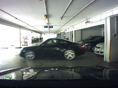 Trong hầm đỗ xe, người lái xe bất ngờ nhầm chân phanh và chân ga khiến chiếc xe Porsche Cayman của mình bị phá hỏng phần đuôi xe do va chạm.