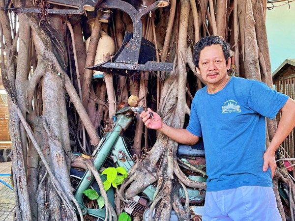 Được bọc trong những chùm rễ cây ngoằn ngoèo, cổ quái, “báu vật” của người đàn ông mê xe máy cũ ở Bình Dương khiến khách tham quan bất ngờ, hỏi mua với giá khủng.