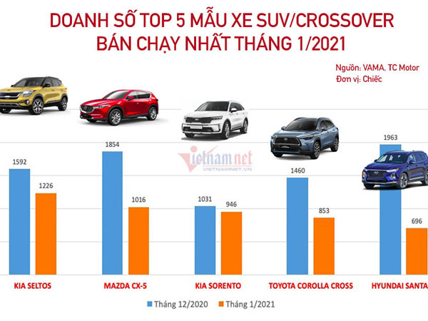 Danh sách xe thể thao đa dụng (SUV/Crossover) bán chạy nhất tháng 1/2021 vừa qua chứng kiến sự xáo trộn lớn về thứ tự xếp hạng.