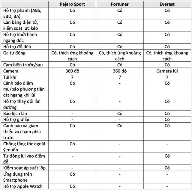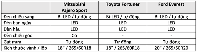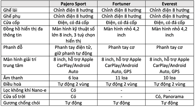 Đâu là mẫu SUV 7 chỗ đáng lựa chọn nhất cho bạn? Dưới đây là bảng so sánh trang bị của 3 mẫu SUV 7 chỗ với các phiên bản cao cấp nhất gồm Pajero Sport 2.4AT 4x4, Fortuner Legender 2.8AT 4x4 và Everest Titanium 2.0AT 4x4.