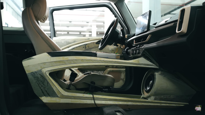 Phần cánh cửa được thiết kế mới, sử dụng vật liệu MDF chống thấm, design lại hết toàn bộ để lắp loa. Tay sales "Mẹc" khét tiếng tiết lộ hệ thống loa của xe là mẫu 3-way cao cấp của Focal, nút bấm cảm ứng tới từ Mercedes 2024.