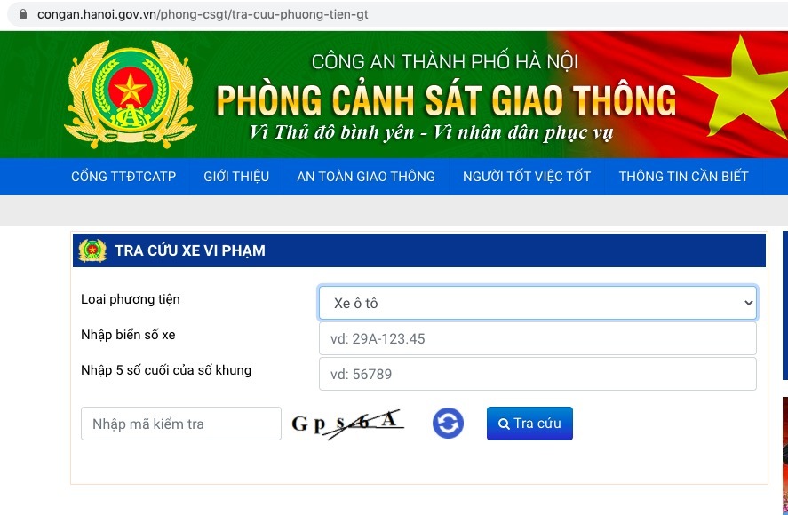 - Nếu ở Hà Nội, truy cập trang www.congan.hanoi.gov.vn/phong-csgt/tra-cuu-phuong-tien-gt, sau đó nhập chủng loại xe, biển kiểm soát, số khung,… để tra cứu;
