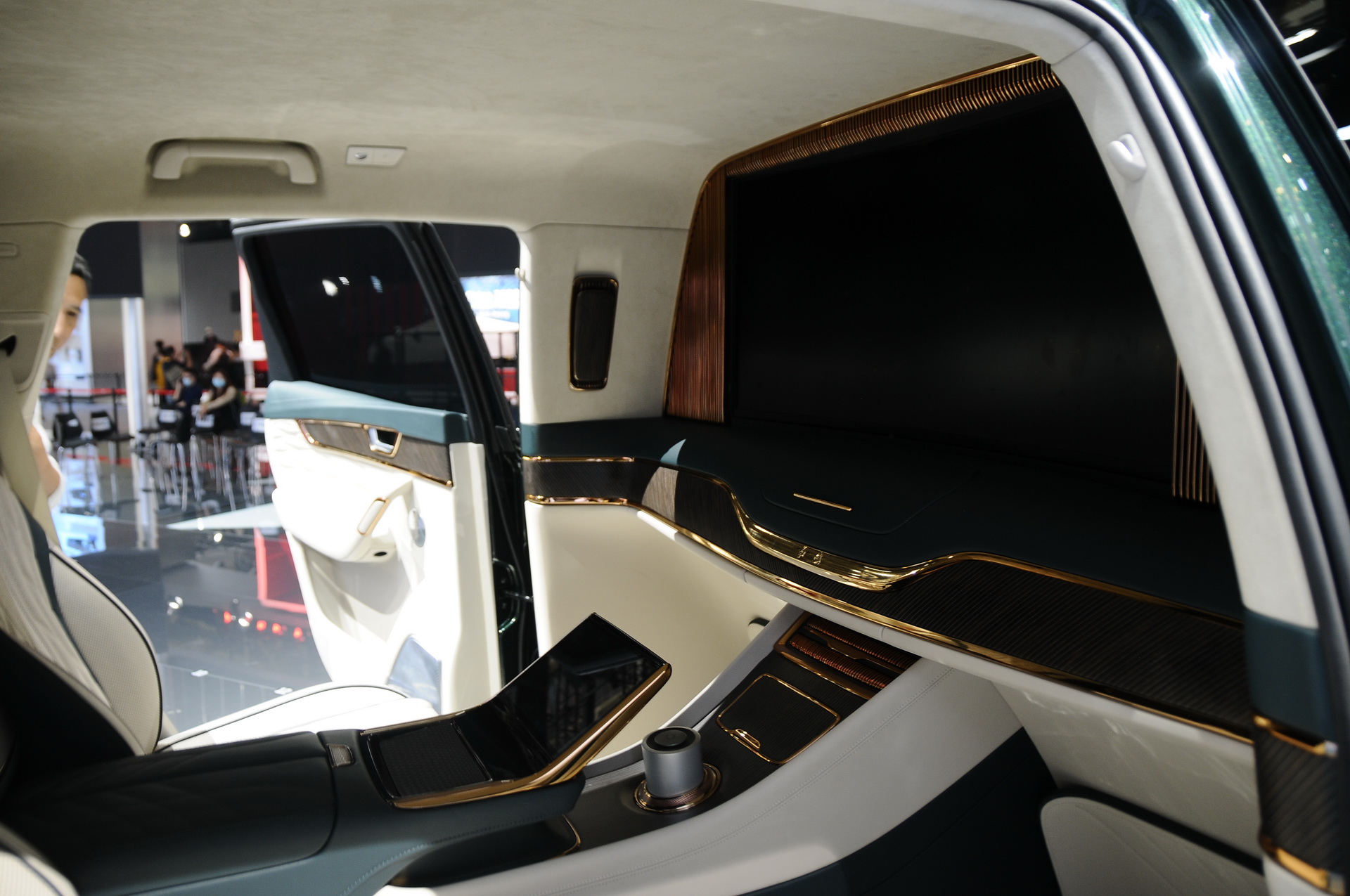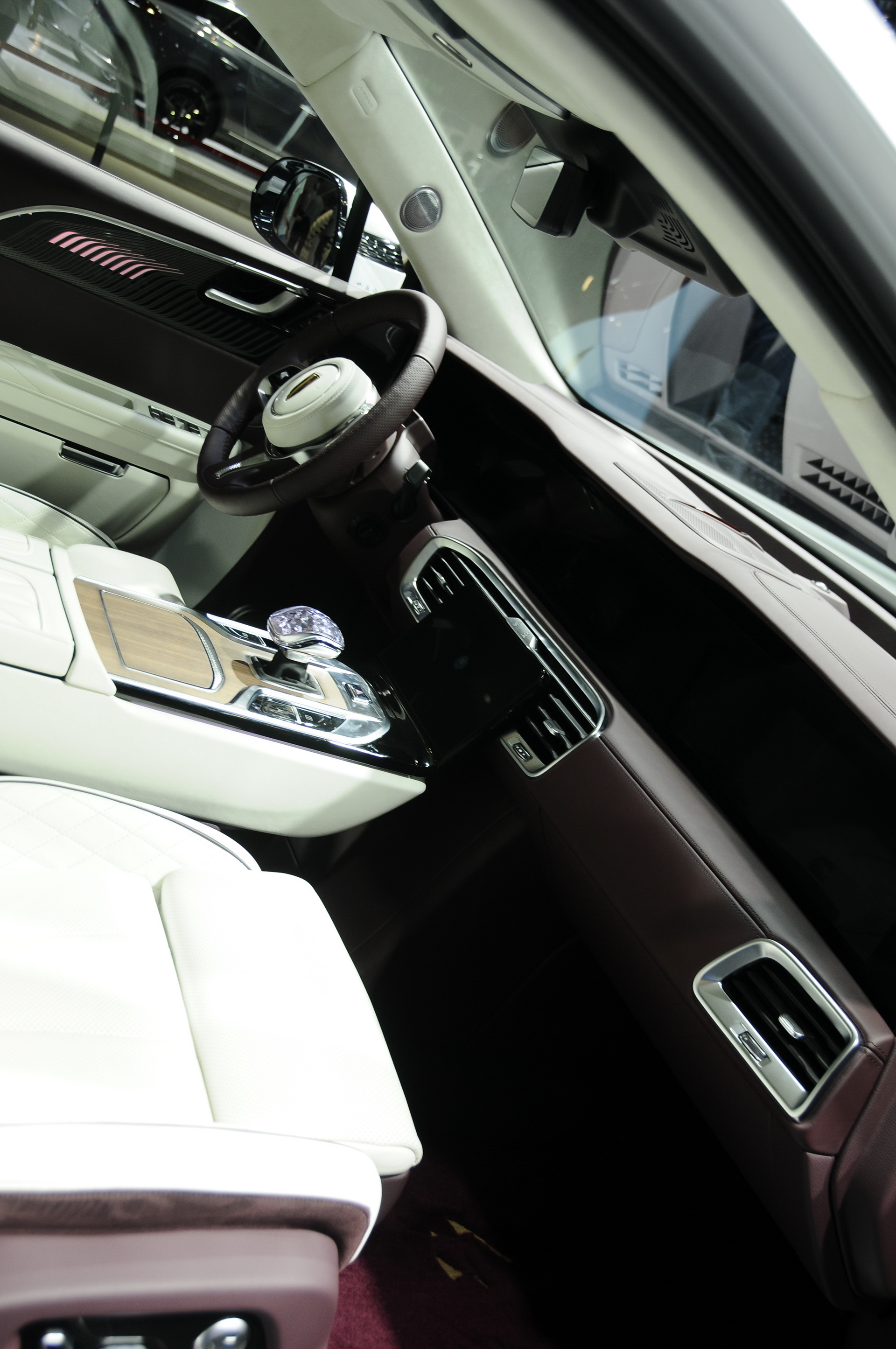 Nhờ chiều dài cơ sở tăng tương ứng (+200 mm, tổng 3.260 mm), nội thất xe rộng rãi không kém bất cứ đối thủ nào trên thị trường và cho phép thương hiệu chủ quản tích hợp ngăn lạnh đựng sâm panh giữa 2 ghế đơn siêu sang phía sau. Nội thất xe chọn tông trắng kem trang nhã và không kém phần sang trọng làm chủ đạo, điểm xuyết bởi ánh đỏ chủ yếu ở nửa dưới cabin chẳng hạn thảm trải sàn.
