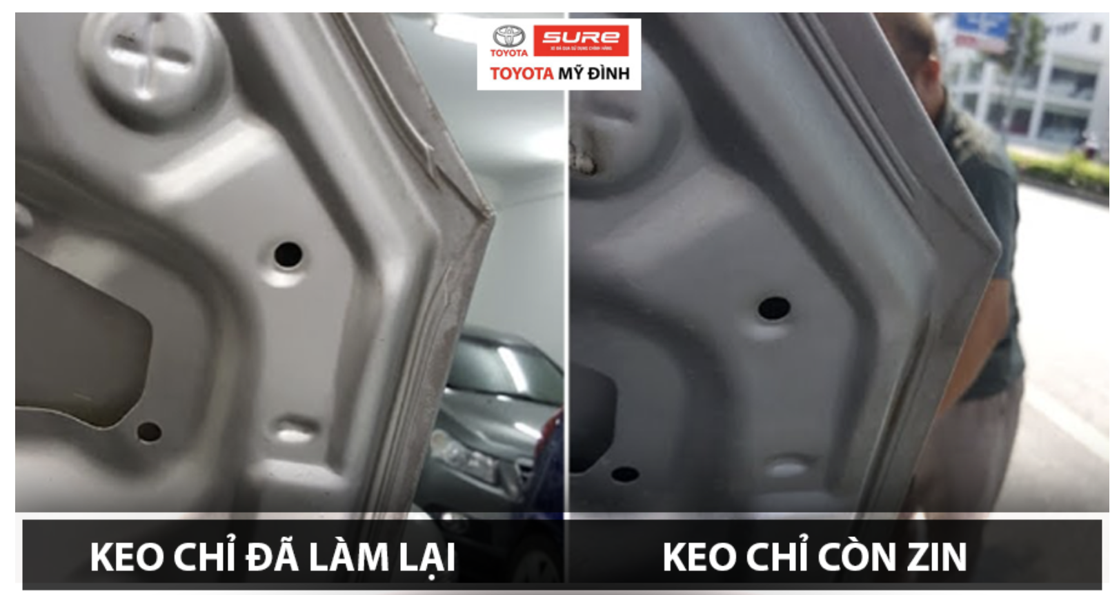 Ngoài việc sờ nắn, qua mắt thường quan sát, nhất là với xe có nước sơn sáng màu như trắng, dễ thấy keo chỉ theo thời gian sẽ ngả màu vàng. Nếu đã làm làm lại sẽ có màu mới, hay có vết hoặc không thẳng hàng.
