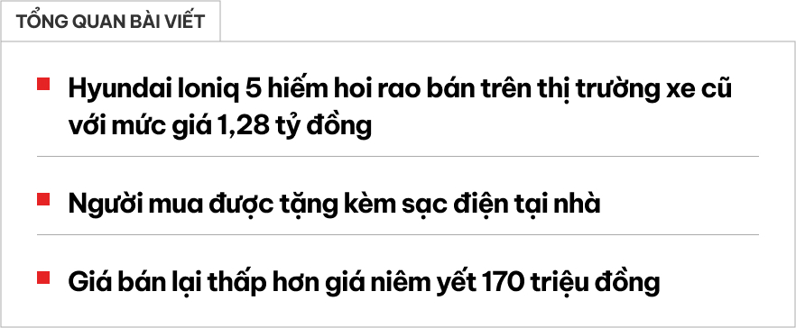 Một chiếc Hyundai Ioniq 5 2023, bản Prestige đang xuất hiện thị trường xe cũ. Tìm kiếm trên các nền tảng bán xe, đây có lẽ là chiếc Ioniq 5 hiếm hoi đã qua sử dụng được bán lại. ODO được công bố là 8.000 km cùng mức giá sang tay 1,28 tỷ đồng. Chiếc xe này có kèm sạc điện tại nhà khi mua xe, điều quan trọng đối với mẫu xe Hàn Quốc bởi số lượng trạm sạc có thể sạc cho mẫu xe này vẫn còn rất ít.