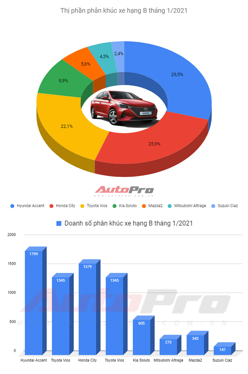 Cái tên Hyundai Accent đã chiếm lấy vị trí số 1 về doanh số trong phân khúc hạng B với gần 1.800 xe tới tay người tiêu dùng trong nước ngay thời điểm đầu năm, chiếm 29,5% thị phần. Ở vị trí thứ hai là Honda City với 1.579 xe. Một phần yếu tố giúp đạt được thành tích này chính là sự xuất hiện của phiên bản hoàn toàn mới với nhiều điểm nâng cấp về thiết kế, công nghệ theo xe.