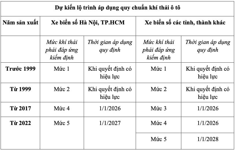 Theo đó, ô tô sản xuất trước năm 1999 sẽ áp dụng mức 1, trong khi các xe từ năm 1999 trở đi phải đạt mức 2. Xe sử dụng động cơ xăng hoặc diesel sản xuất từ năm 2017 sẽ áp dụng mức 3 từ ngày 1/1/2026.