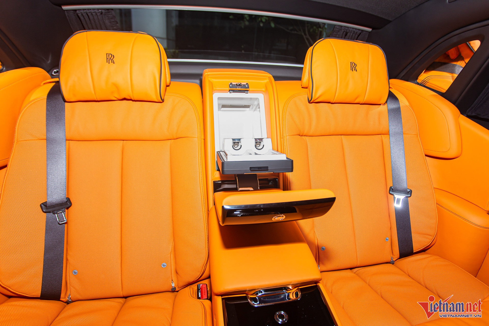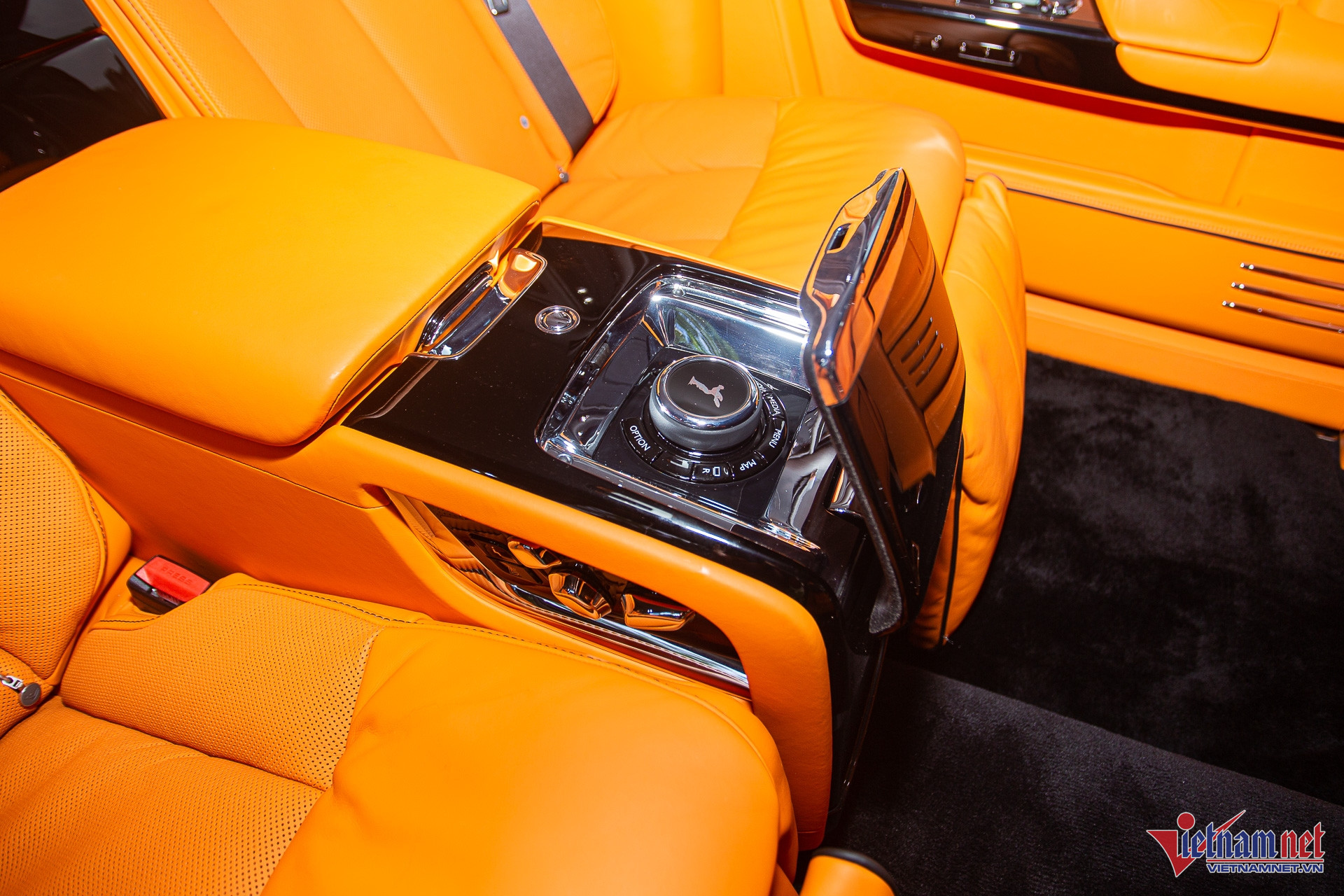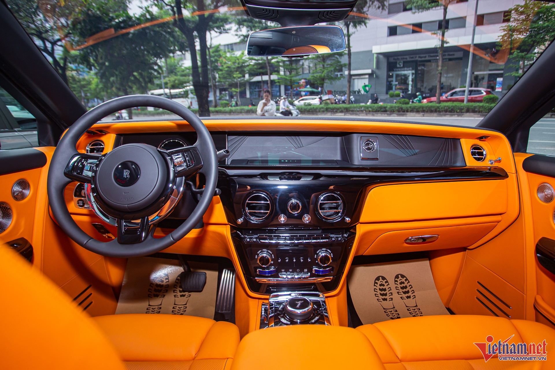 Nội thất của chiếc Rolls-Royce trị giá hơn 63 tỷ đồng này nổi bật với tông màu cam Mandarin, sử dụng nhiều loại vật liệu như da cao cấp, gỗ, kim loại. Phía sau vô-lăng là màn hình đa thông tin dạng cơ học kết hợp kỹ thuật số. Đặt chính giữa táp-lô là màn hình giải trí 12,3 inch có thể đóng/mở bằng nút bấm. Táp-lô bên phụ có thêm đồng hồ analog đặc trưng của hãng.