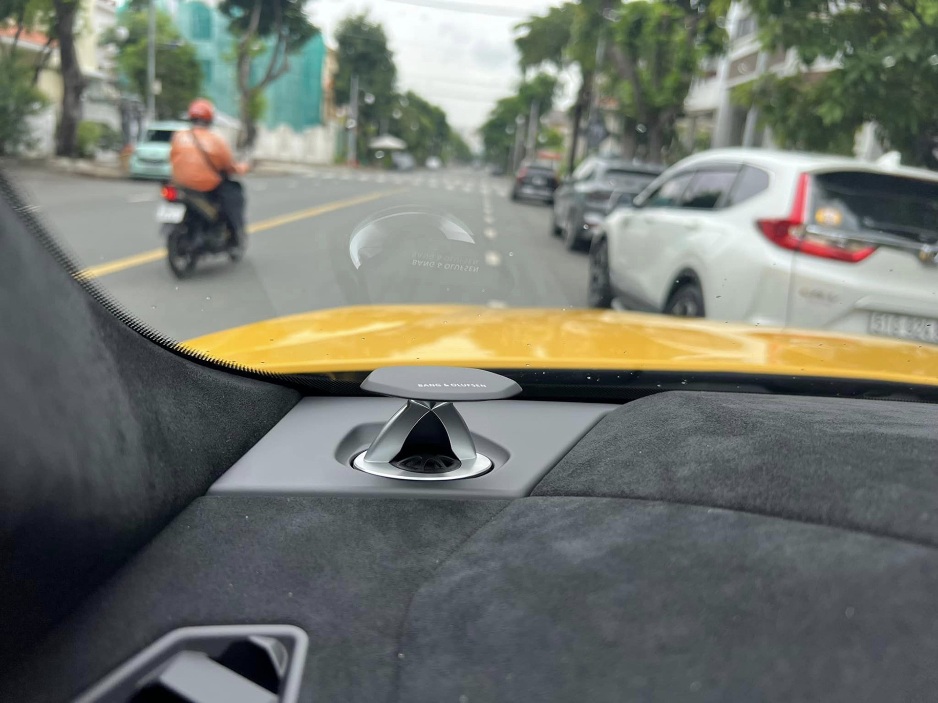 Khoang nội thất xe không khác xe mới khi mới lăn bánh vỏn vẹn 3.000 km. Ghế ngồi bọc vật liệu Alcantara hay bậc cửa chưa có dấu hiệu “lão hóa” của thời gian. Tông màu chủ đạo trong cabin xe là đen, đi kèm đường chỉ khâu và đường viền màu vàng tương phản. Tùy chọn đắt tiền nhất là hệ thống âm thanh cao cấp Bang&Olufsen với giá trị gần 500 triệu đồng.