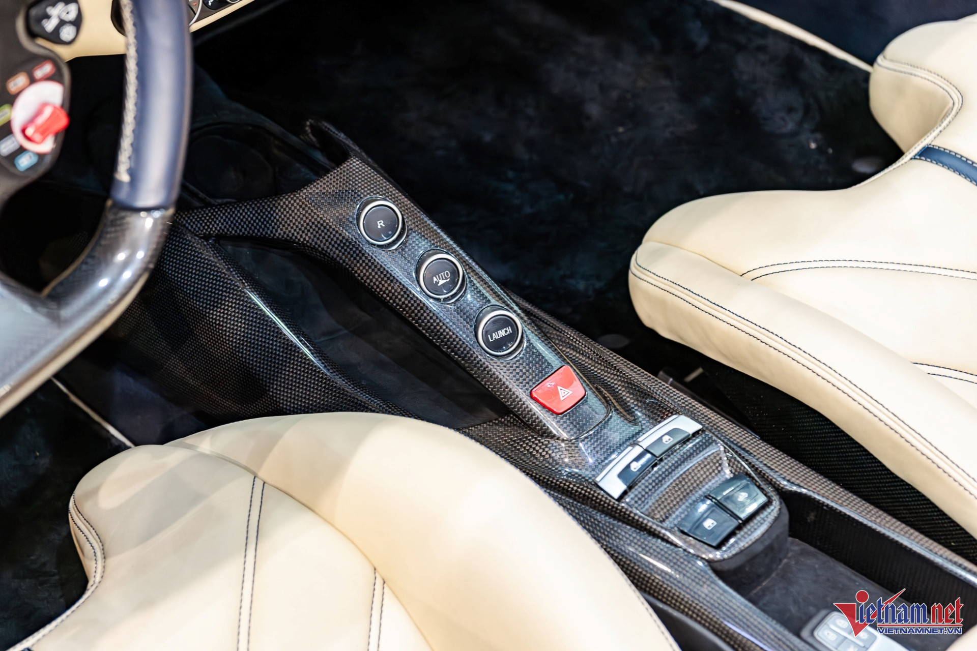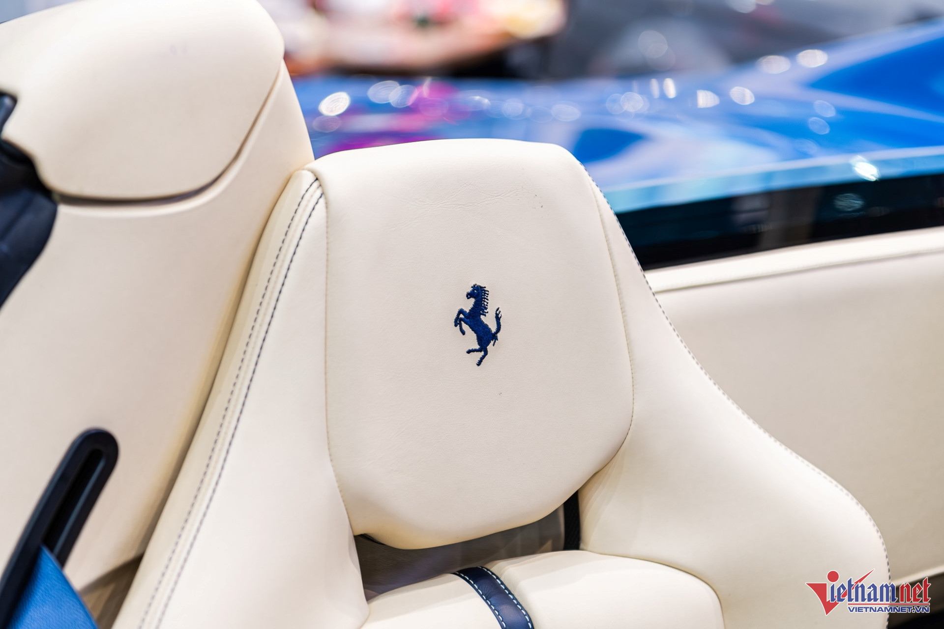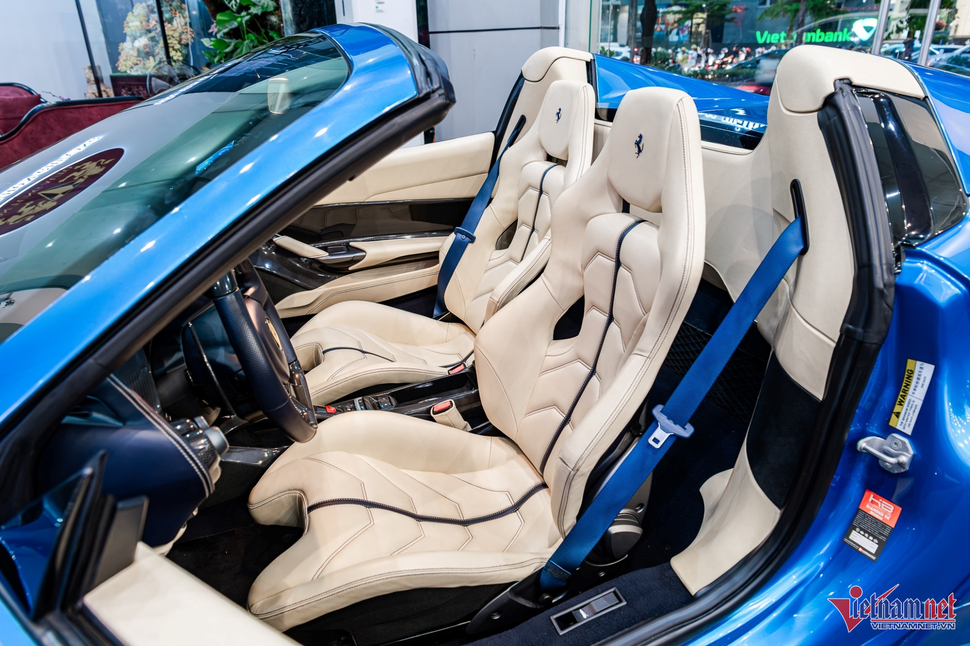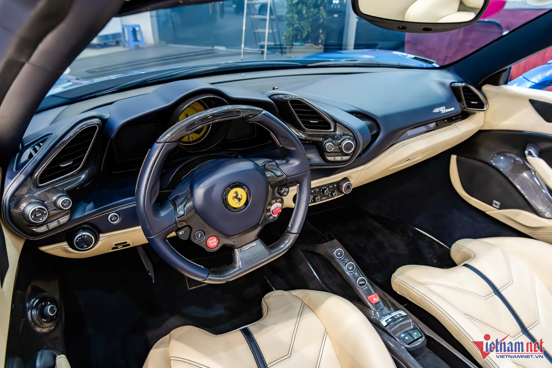Bên trong nội thất chiếc Ferrari 488 Spider đầu tiên về Việt Nam là tông màu xanh dương đậm kết hợp cùng màu kem theo phong cách Luxury (sang trọng). Các chi tiết bọc da không xuất hiện vết nhăn là dấu hiệu cho thấy xe được chăm sóc kỹ và ít sử dụng.