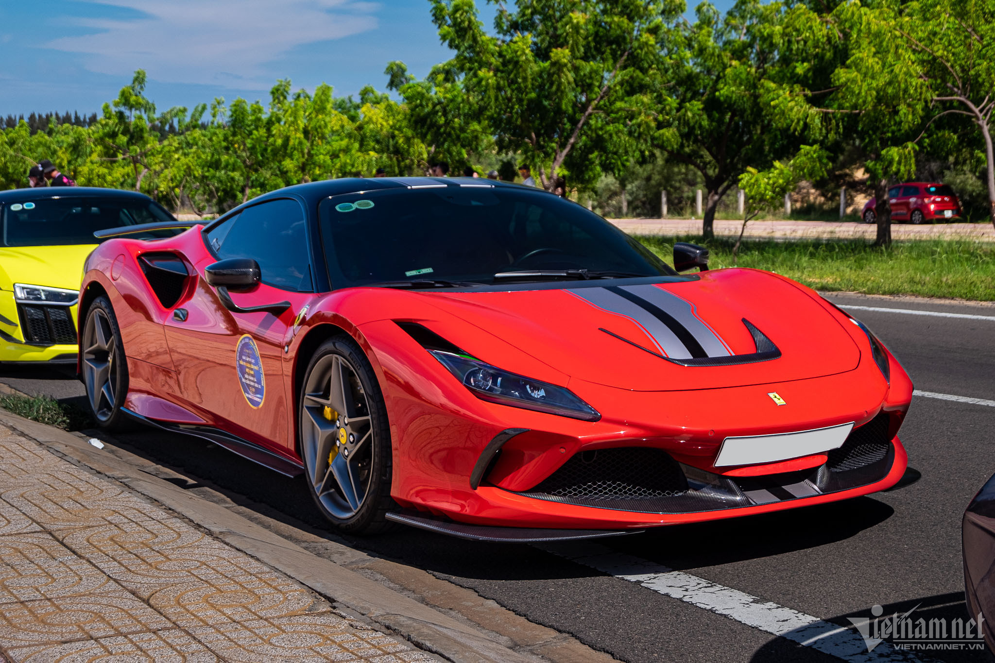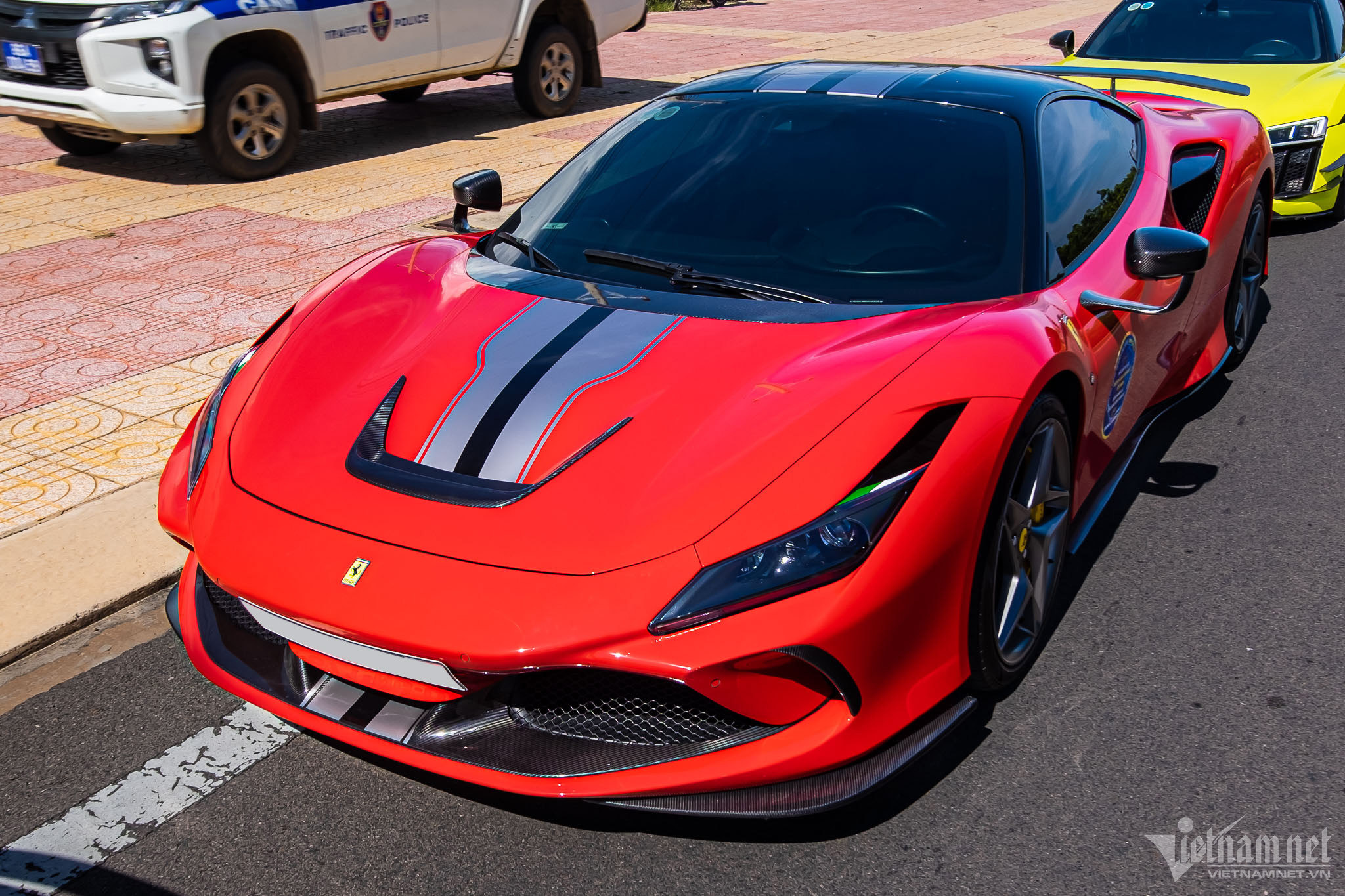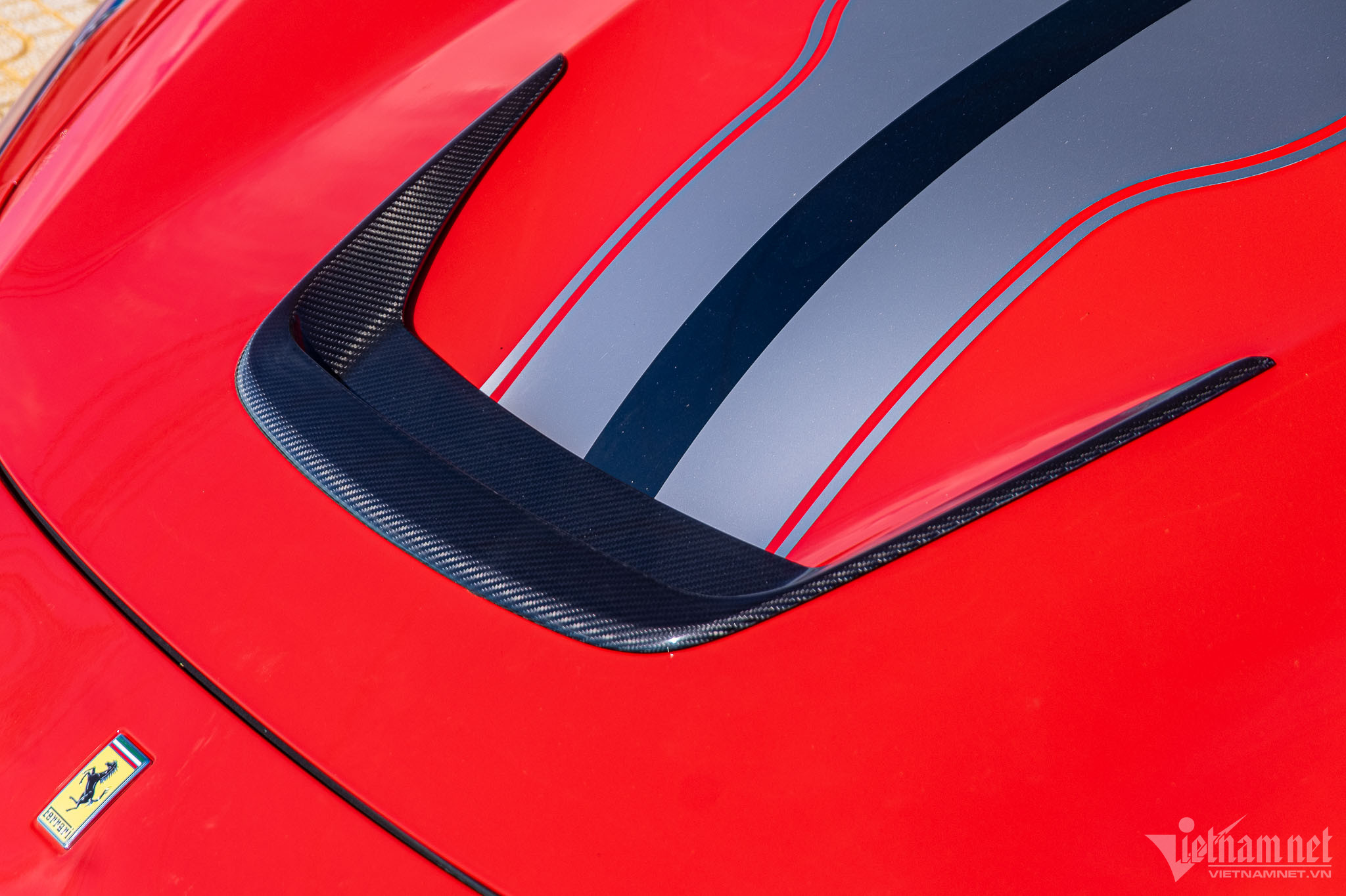 Chiếc Ferrari F8 Tributo này là một trong số đó. Xe thuộc sở hữu của một đại gia có tiếng ở TP.HCM. Chiếc xe có ngoại thất sơn màu đỏ Rosso Corsa đặc trưng của hãng siêu xe Ý, vốn được ưa chuộng trên nhiều chiếc Ferrari tại Việt Nam. Để tạo điểm nhấn cho ngoại thất, chủ xe đã dán thêm sọc kẻ màu bạc kéo dài từ đầu đến đuôi xe, lấy cảm hứng từ mẫu xe 488 Pista.