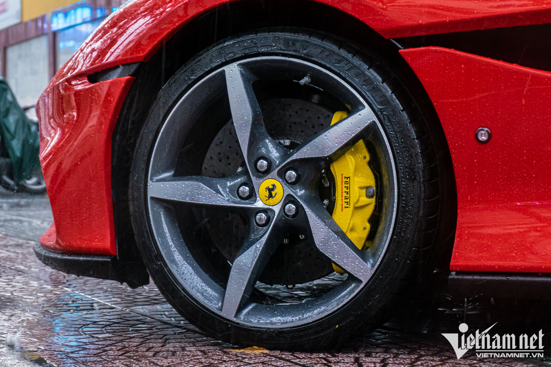 Bộ mâm 5 chấu đơn trên chiếc Ferrari Portofino M đầu tiên về Việt Nam được hoàn thiện hai màu sáng tối, với kích thước 20 inch. Bên trong là đĩa phanh gốm-carbon cỡ lớn cùng kẹp phanh màu vàng nổi bật của Brembo.