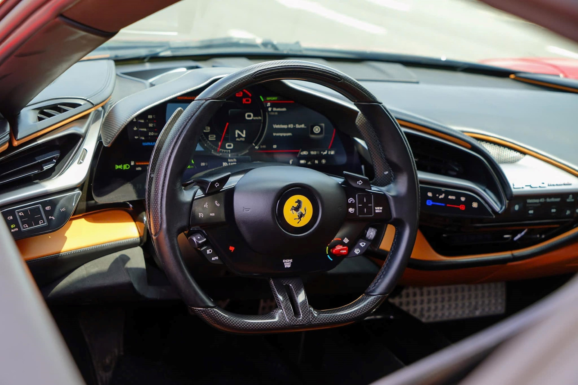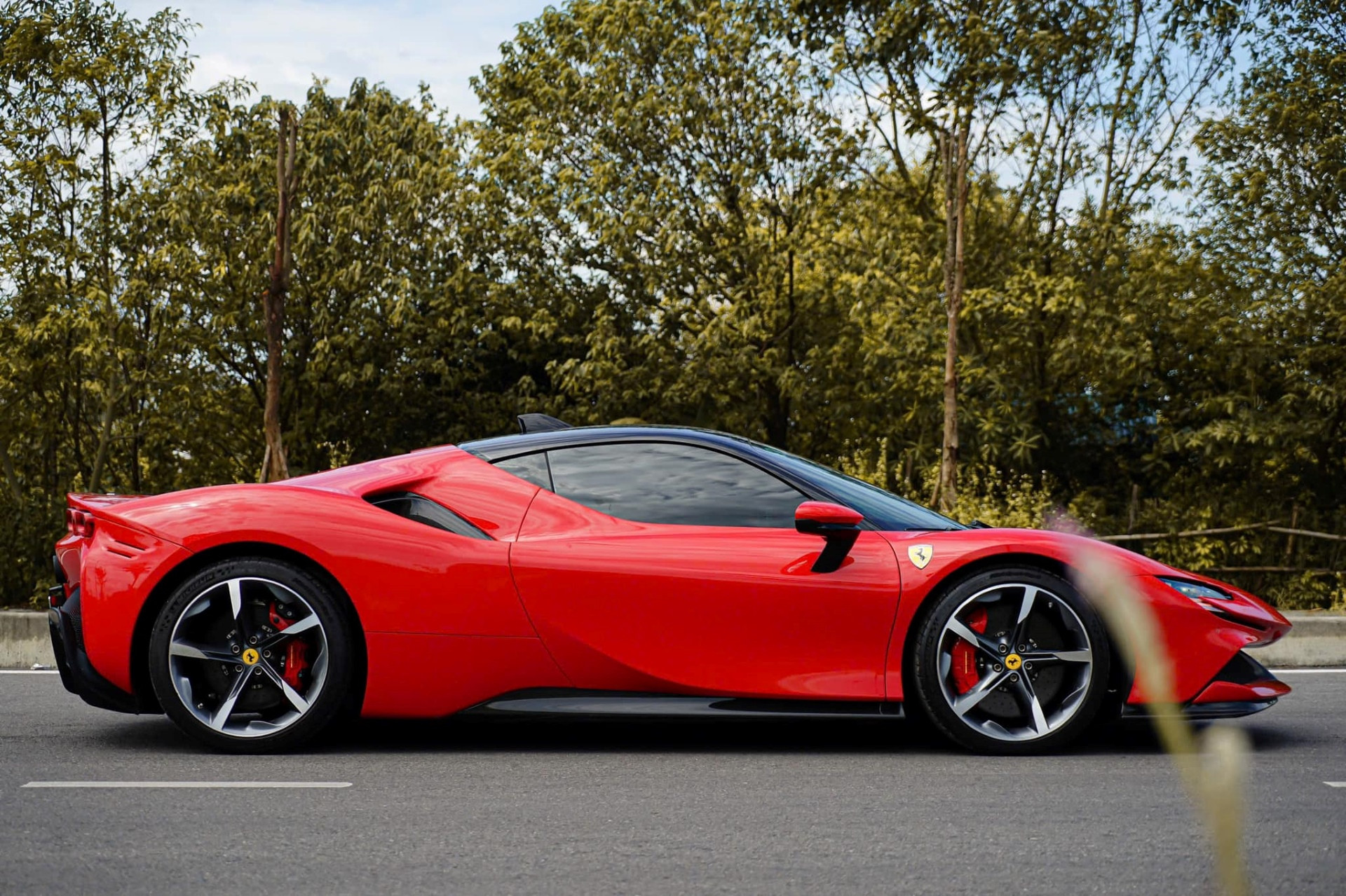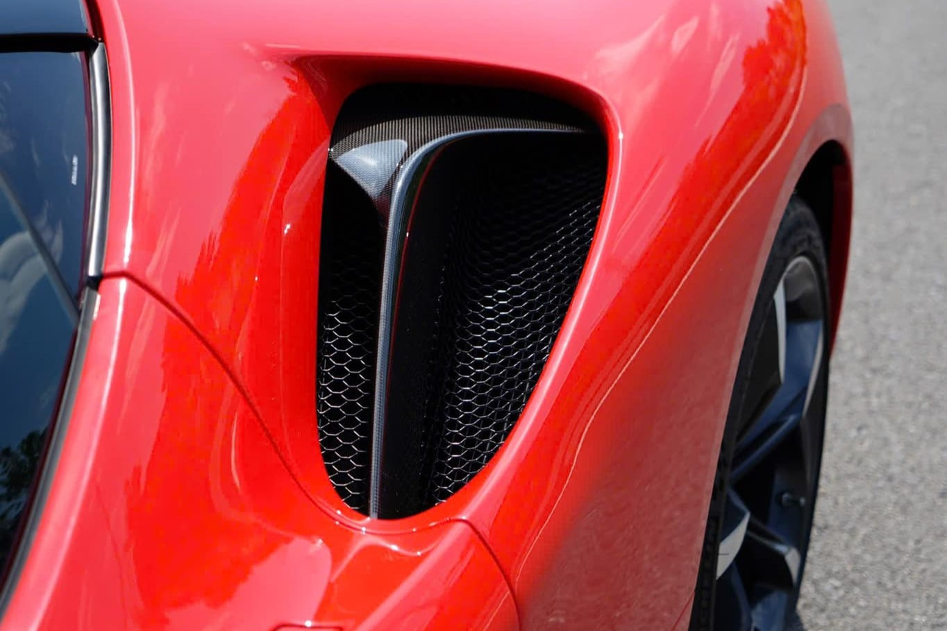 Xe sử dụng bộ mâm 5 chấu đơn, hoàn thiện hai tông màu sáng - tối giống nhiều chiếc SF90 khác tại Việt Nam. Tuy nhiên, ông chủ phòng trà nổi tiếng đã chi thêm nhiều tiền để mua tùy chọn sợi carbon cho hàng loạt chi tiết như bộ chia gió cản trước, ốp sườn, hốc gió và bộ khuếch tán.