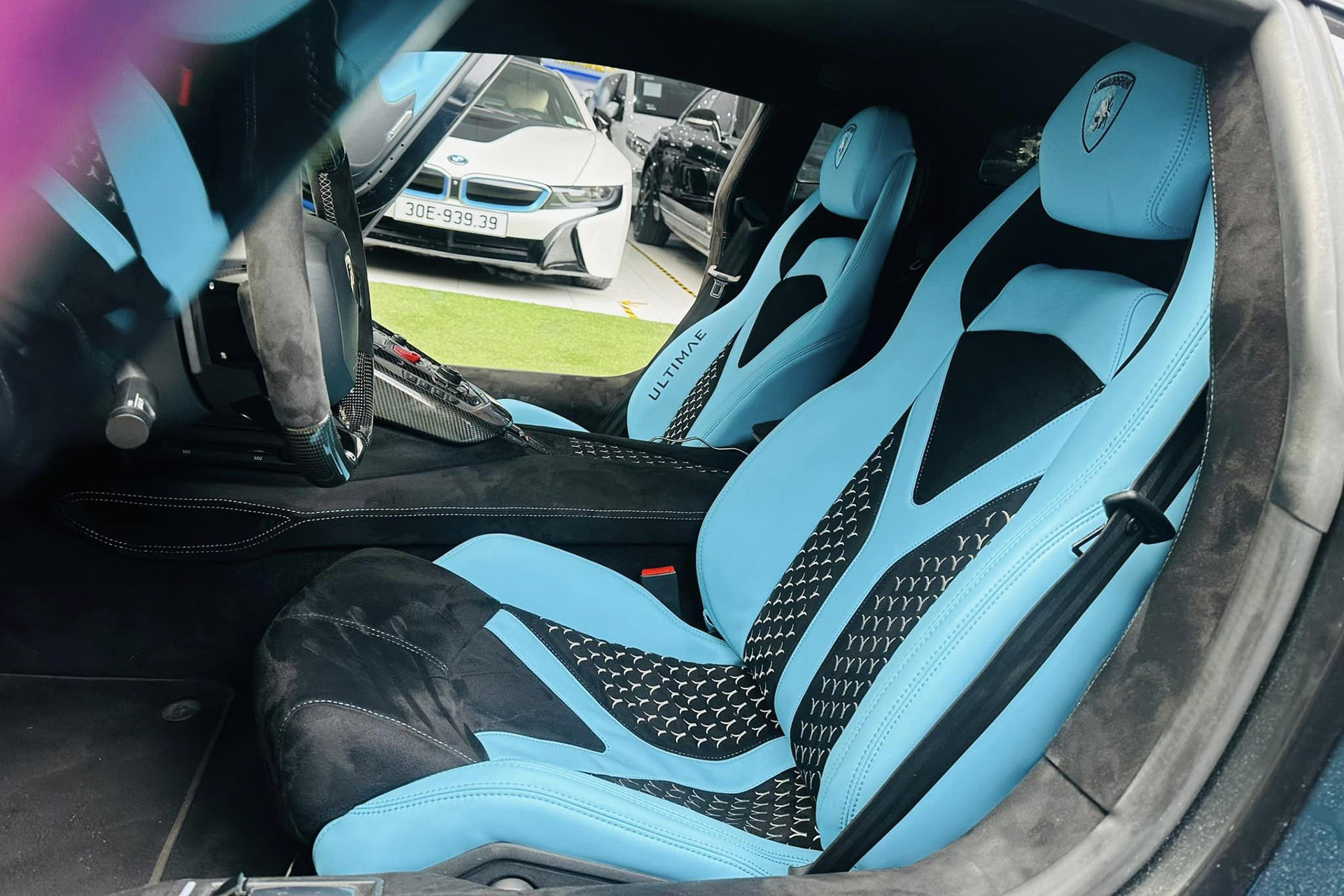 Sau 8 năm về Việt Nam, nội thất nguyên bản màu đen trên xe đã xuất hiện dấu hiệu “lão hóa”. Vì vậy gần đây, showroom rao bán xe đã bọc lại khoang cabin với hai tông màu đen và xanh dương. Nhiều chi tiết ốp sợi carbon xuất hiện trên vô-lăng, bảng đồng hồ, bảng điều khiển,… Táp-lô và táp-pi cửa khâu thêm các họa tiết màu trắng tạo điểm nhấn.