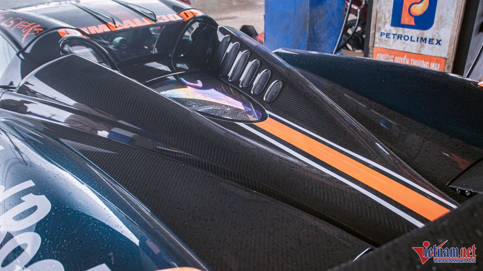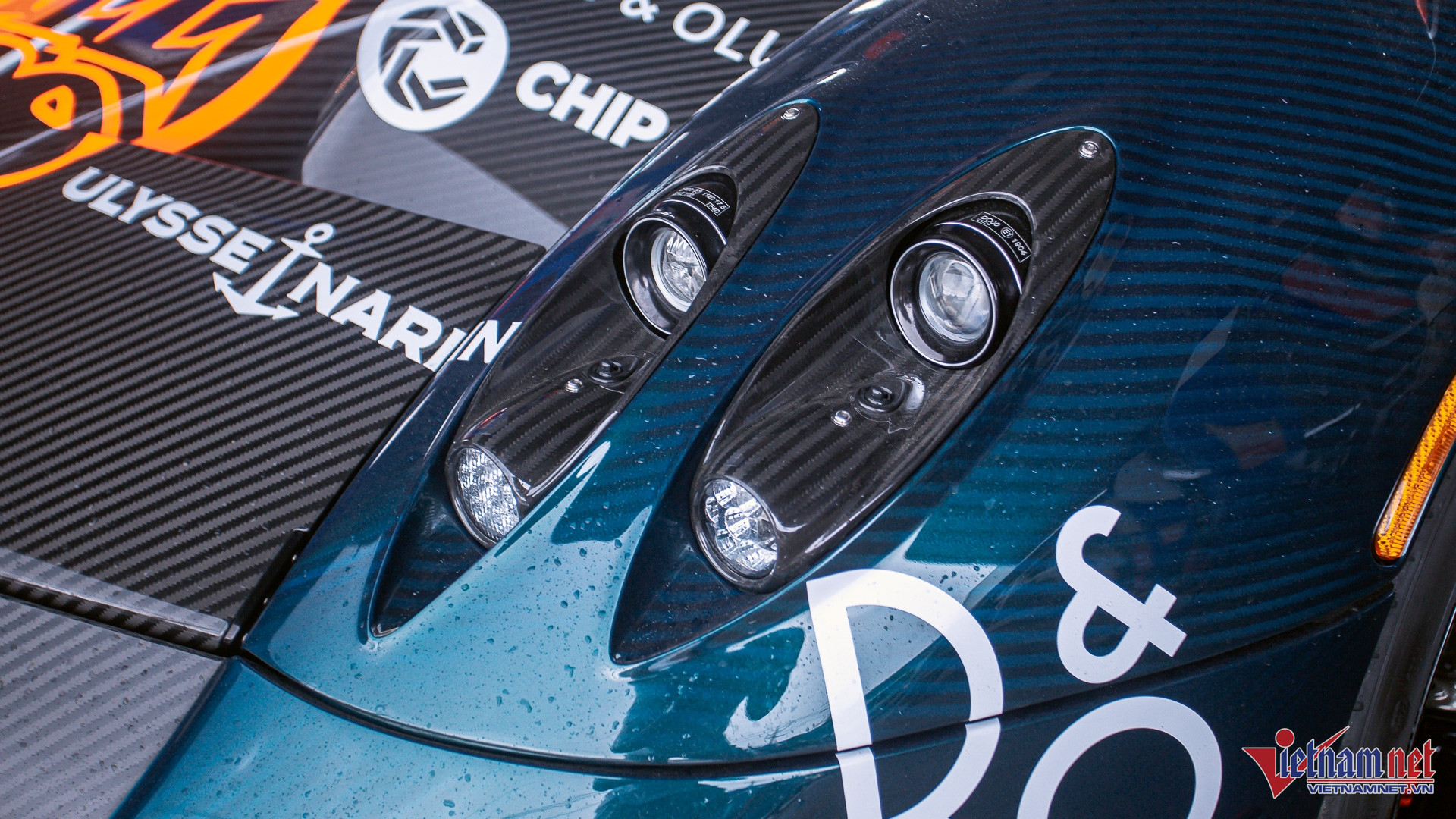 Chiếc Pagani Huayra Roadster BC đầu tiên xuất hiện tại Việt Nam đặc biệt hơn nhiều chiếc khác, bởi thân xe làm hoàn toàn bằng sợi carbon. Tông màu xanh rêu là chủ đạo, kết hợp với màu đen ở một số chi tiết như nắp ca-pô, cánh gió, ốp đèn chiếu sáng/đèn hậu, mui xe và nắp động cơ.