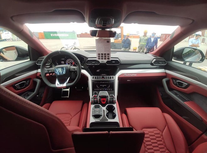 Nội thất chiếc Lamborghini Urus thứ 11 tại Việt Nam có ghế ngồi bọc da màu đỏ Rosso Alala với các đường chỉ khâu theo phong cách Q-citura. Vật liệu sợi carbon cũng được sử dụng rộng rãi bên trong khoang cabin xe.