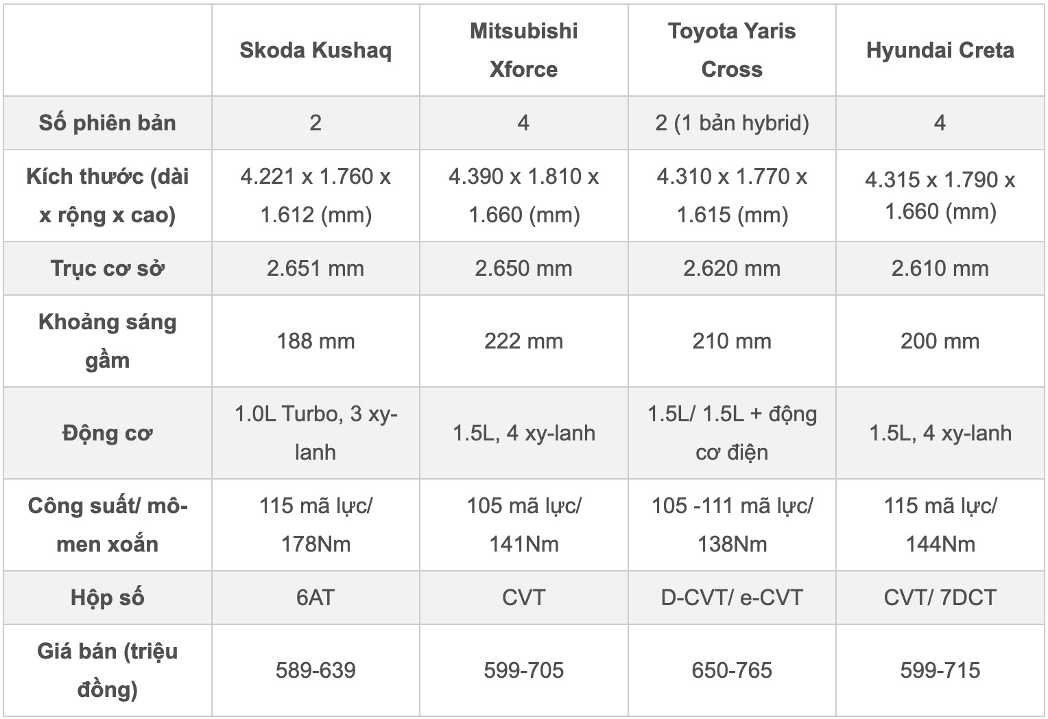 So sánh nhanh thông số của Skoda Kushaq với một số đối thủ trong phân khúc B-SUV: