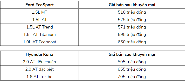Trong khi Hyundai Kona được giảm 40 triệu đồng so với niêm yết thì Ford EcoSport đang được ưu đãi từ 35 đến 40 triệu đồng so với giá niêm yết.